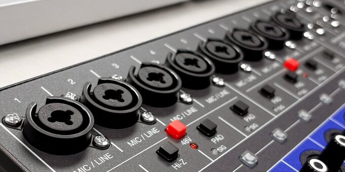 Combo inputs support XLR or 1/4-inch connections. Channels 1 and 2 offer Hi-Z inputs for connecting an electric guitar or bass. Channels 9/10 and 11/12 have TS line connectivity for keyboards and other audio devices.