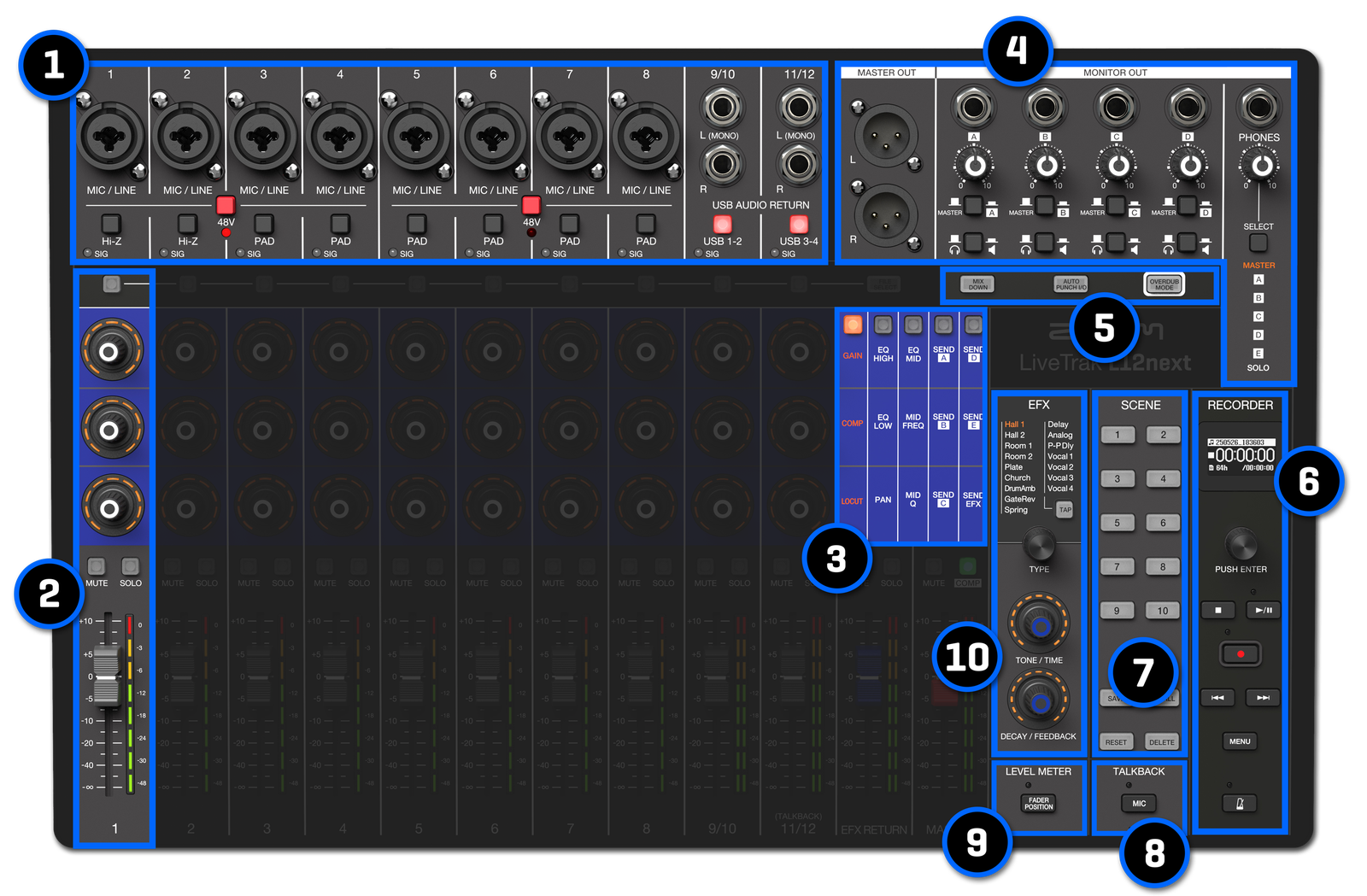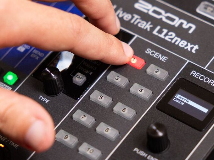 The L12next stores up to 10 scene memories, saving fader positions, EQ, pan, mutes and effects. Instantly recall mixes for live performances or recording in the studio.