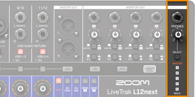 The L12next combines the power of a digital mixer with analog-style operation. Three knobs per channel can deliver High/Mid/Low EQ control. With a simple switch you can also adjust gain, pan, and sends, offering hands-on mixing, just like an analog console.